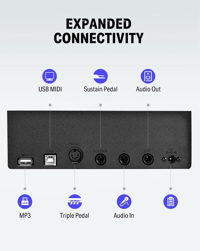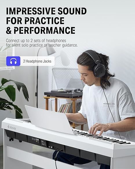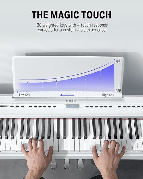 88 מקשים משוקללים בגודל מלא: מקשים פטישיים עם תגובת מגע מתכווננת, המחקים את תחושת הנגינה בפסנתר אמיתי.